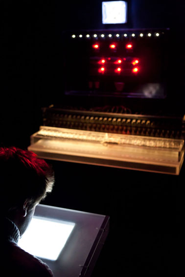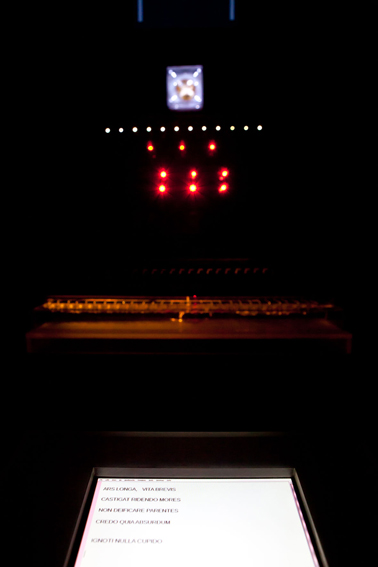 Displayed on a screen, in this sort of "technological altar” images anointed with some kind of mysticism can be inferred, images that may well refer to the Most Sacred Heart of Jesus, accompanied by the surround sound of the heart and breathing rate of a body at rest. Heart beats are accelerated till reaching the typical beats of a pulsing heart, whose frequency will modify the ignition of led sets, thus generating an electronic prototype of “altar”. Through a system of microprocessors, an original pacemaker of the late 60s will be sending pre-programmed signals to a “robot” with 30 metallic arms intended for typing messages which will serve as the spiritual homework habitually recommended by priests to the faithful in the Most Sacred Heart of Jesus Church.